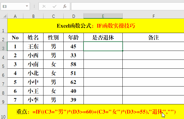 在目標(biāo)單元格中輸入公式:=IF((C3="男")*(D3>=60)+(C3="女")*(D3>=55),"退休","")。
