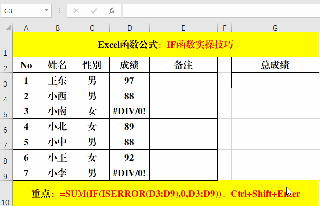 在目標(biāo)單元格中輸入公式:=SUM(IF(ISERROR(D3:D9),0,D3:D9))。