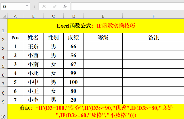 在目標(biāo)單元格中輸入公式:=IF(D3=100,"滿分",IF(D3>=90,"優(yōu)秀",IF(D3>=80,"良好",IF(D3>=60,"及格","不及格"))))。