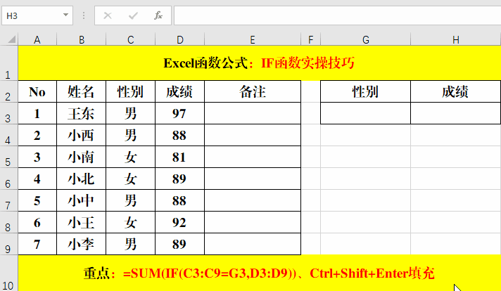 2、配合Sum函數(shù)求和其實(shí)就是Sumif函數(shù)的功能,所以公式還可以變更為:=SUMIF(C3:C9,G3,D3:D9)。