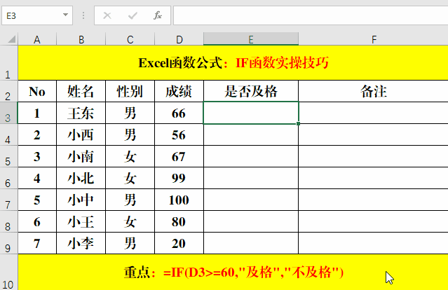 在目標(biāo)單元格中輸入公式:=IF(D3>=60,"及格","不及格")。