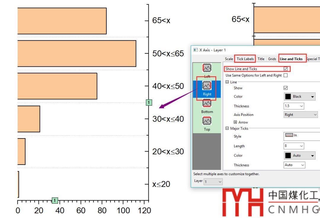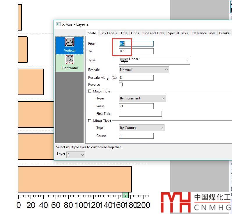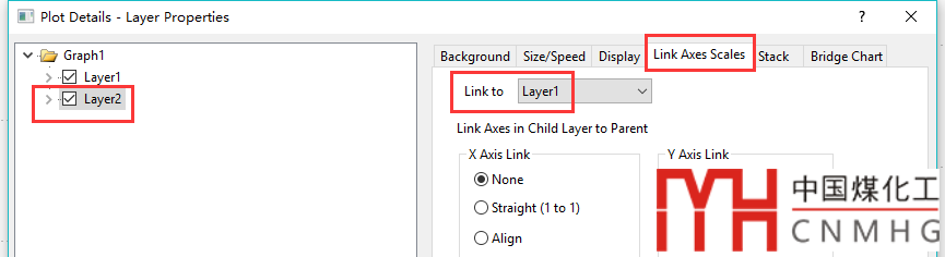 在左側(cè)圖形的Layer Properties->Link Axes Scales下,選則和圖層1(右側(cè)圖形)關(guān)聯(lián)。