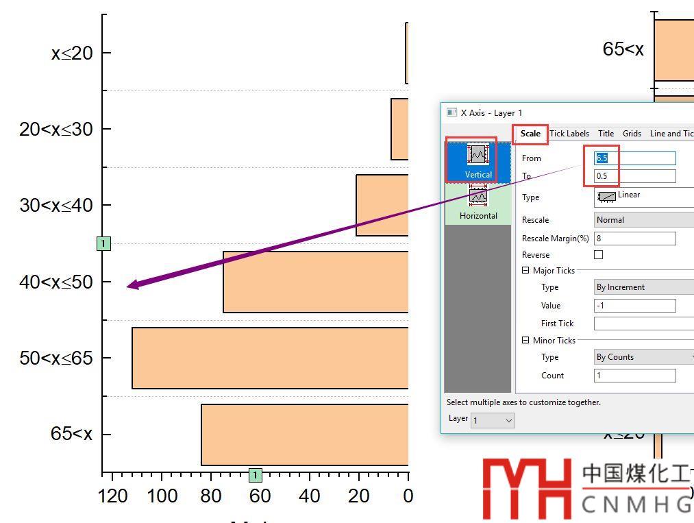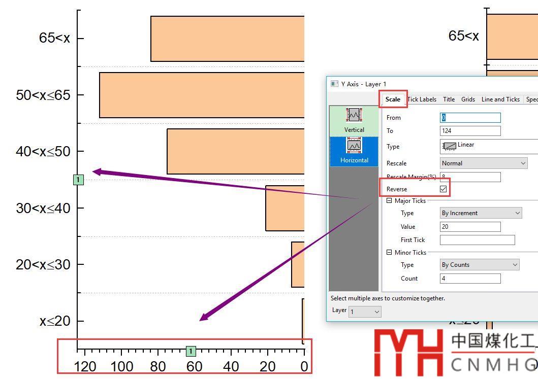 橫坐標(biāo)軸需要翻轉(zhuǎn)方向,在Axis Properties->Scale下,選中Reverse,此時(shí)橫坐標(biāo)方向反了過(guò)來(lái),同時(shí)縱坐標(biāo)軸也做了翻轉(zhuǎn)。