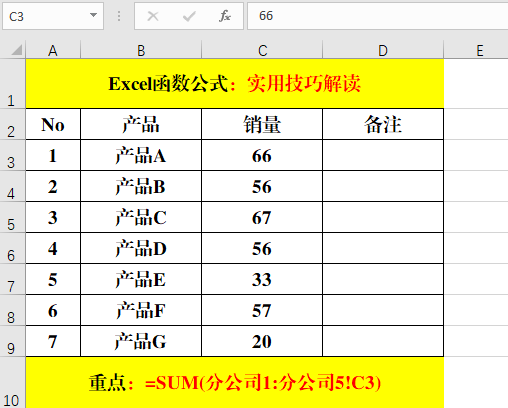 在目標(biāo)單元格中輸入公式:=SUM(分公司1:分公司5!C3)。