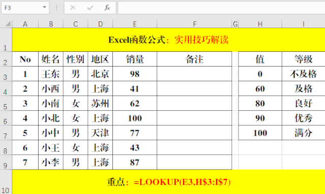 在目標(biāo)單元格中輸入公式:=LOOKUP(E3,H$3:I$7)。