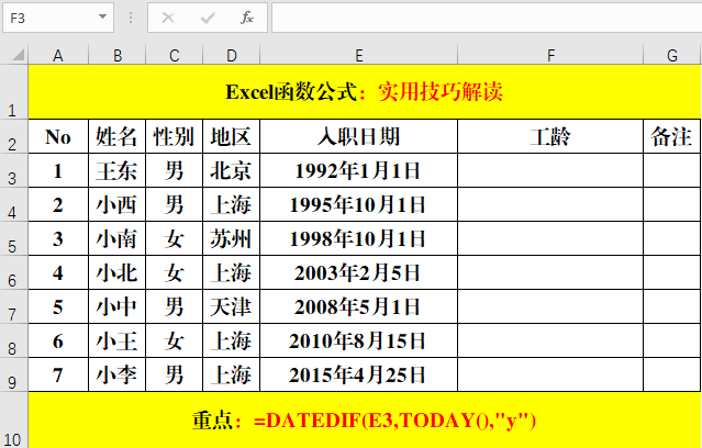 在目標(biāo)單元格中輸入公式:=DATEDIF(E3,TODAY(),"y")。