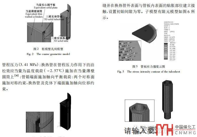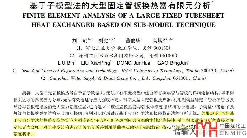 16-17年河北工業(yè)大學(xué)高炳軍教授團隊已經(jīng)把極限分析應(yīng)用到了DN4600大型換熱器換熱器管頭焊縫的評價上,有限元模型總單元數(shù)多達7895194個,總節(jié)點數(shù)為9483492個。極限分析有效避免了彈性方法的保守性,這對制造成本的控制有十分明顯的益處,同時也說明不要輕易把彈性應(yīng)力分類設(shè)計方法的結(jié)果作為管頭設(shè)計的唯一依據(jù),GB/T151的工程經(jīng)驗以及塑性方法的結(jié)果有時是很有必要考慮。這篇文章的計算規(guī)模可以進一步降低,比如換熱器采用實體單元-線體單元組合的方法,這個方法在外文文章里面已經(jīng)有報道了。