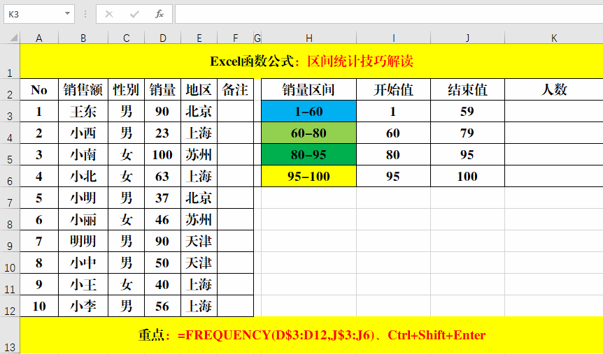 在目標(biāo)單元格中輸入公式:=COUNTIFS(D$3:D12,">="&I3)-COUNTIFS(D$3:D12,">"&J3)。