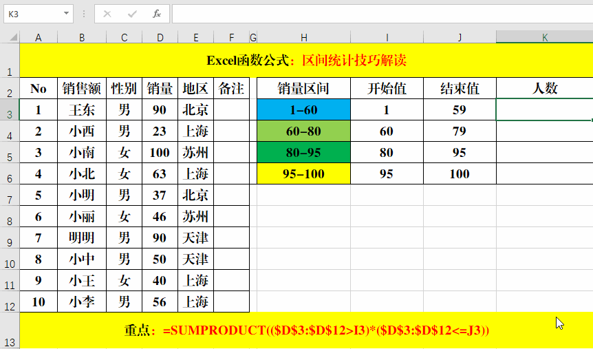 在目標(biāo)單元格中輸入公式:=SUMPRODUCT(($D$3:$D$12>I3)*($D$3:$D$12<=J3))。