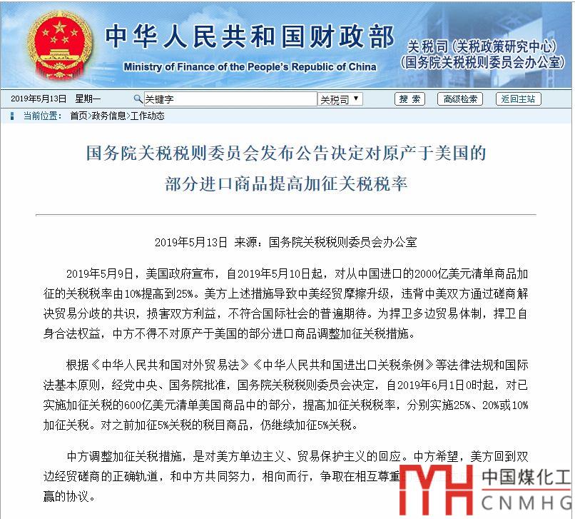 剛剛,國務(wù)院關(guān)稅稅則委員會網(wǎng)站發(fā)布消息,2019年5月9日,美國政府宣布,自2019年5月10日起,對從中國進(jìn)口的2000億美元清單商品加征的關(guān)稅稅率由10%提高到25%。美方上述措施導(dǎo)致中美經(jīng)貿(mào)摩擦升級,違背中美雙方通過磋商解決貿(mào)易分歧的共識,損害雙方利益,不符合國際社會的普遍期待。為捍衛(wèi)多邊貿(mào)易體制,捍衛(wèi)自身合法權(quán)益,中方不得不對原產(chǎn)于美國的部分進(jìn)口商品調(diào)整加征關(guān)稅措施。