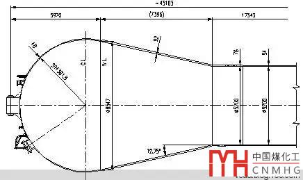 某裝置中一臺(tái)反應(yīng)器,設(shè)計(jì)壓力2.91MPa,設(shè)計(jì)溫170℃,材料Q345R,腐蝕裕量1.5mm,下部筒體直徑為5200mm,裙座支撐,筒體長(zhǎng)度17.343m,筒體厚度為54mm。設(shè)備頂部結(jié)構(gòu)為由錐形筒體與下部筒體和上部的球形封頭相連,錐形筒體厚度92mm,球形封頭半徑SR4381.5mm,厚度48mm。