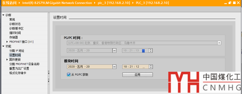 勾選【從PG/PC】獲取選項(xiàng),點(diǎn)擊【應(yīng)用】按鈕,可將PLC的系統(tǒng)時(shí)間設(shè)置成PG/PC的當(dāng)前時(shí)間,如下圖所示: