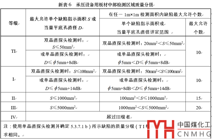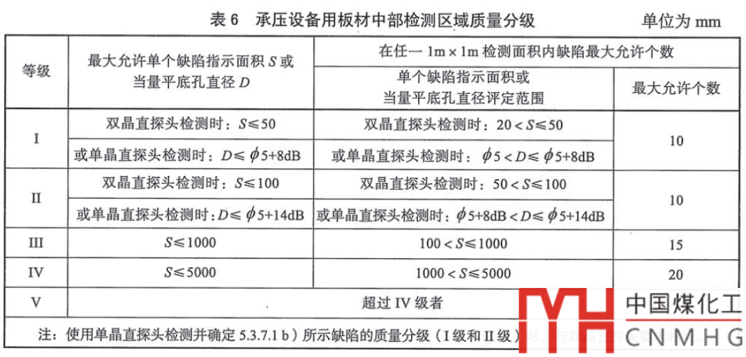 承壓設備用板材中部檢測區(qū)域質量分級,表6如下: