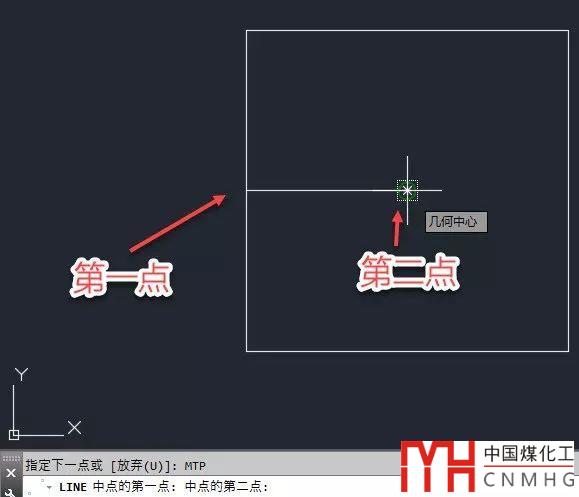 再使用捕捉兩點(diǎn)的中點(diǎn)(MTP)捕捉方式,第一點(diǎn)捕捉矩形相鄰邊的中點(diǎn)和幾何中心之間的中點(diǎn),如下圖所示。