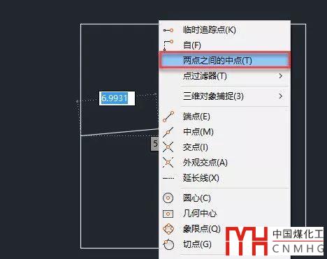 輸入L,回車,第一點(diǎn)捕捉矩形邊的中點(diǎn),在提示指定下一點(diǎn)時按SHIFT+鼠標(biāo)右鍵,在菜單中選擇:兩點(diǎn)之間的中點(diǎn),如下圖所示。