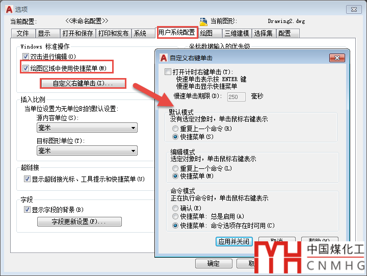 在選項(xiàng)對話框中不僅可以設(shè)置是否在"繪圖區(qū)域中使用快捷菜單",還可以自定義右鍵單擊在不同狀態(tài)下的使用方法,比如在選定對象的時候、編輯模式、命令模式下右鍵右鍵是彈出菜單,還是確認(rèn)或重復(fù)上一命令,還可以打開計時,區(qū)分快速單擊和慢速單擊,在兩種狀態(tài)下采取不同的操作。