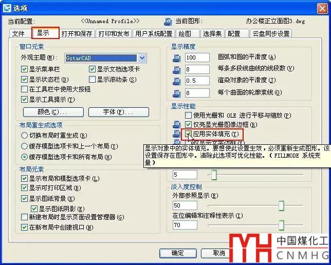 系統(tǒng)變量Fillmode和命令Fill的作用是相同的,“選項”對話框(op)的“顯示”選項卡中的“應用實體填充”的選項設(shè)置的就是Fill參數(shù),如下圖所示。