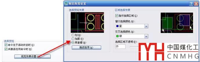 在CAD中,從左向右或從右向左分別表示交叉(cross)和窗口(window)選擇,會CAD的基本都知道,高版本CAD為了更明確這兩種區(qū)別,用顏色進行了區(qū)分,默認狀態(tài)下用藍色表示窗口選擇,綠色表示交叉選擇。如果你對CAD了解的話,這些提示顯然是沒有必要的,你可以關(guān)掉顏色指示效果。在上面的 視覺效果設(shè)置對話框中就可以看到“指示選擇區(qū)域”的勾選項。