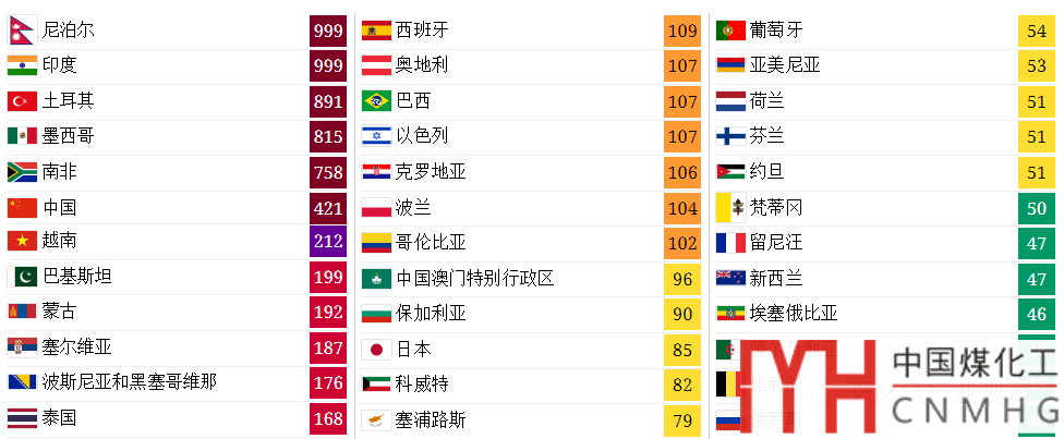 在尼泊爾、印度之后的是土耳其、墨西哥和南非。