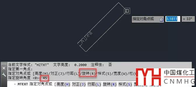 如果我們要書寫傾斜一定角度的文字,可以在確定第二個角點(diǎn)的時候輸入R,然后輸入文字的旋轉(zhuǎn)角度。