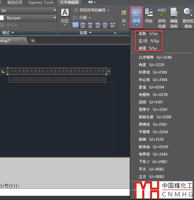 在多行文字編輯器里可以通過輸入%%C和%%D來直接輸入一些特殊符號,也可以直接在多行文字編輯器的下拉列表中直接選擇一些已經(jīng)列好的特殊符號,如下圖所示。