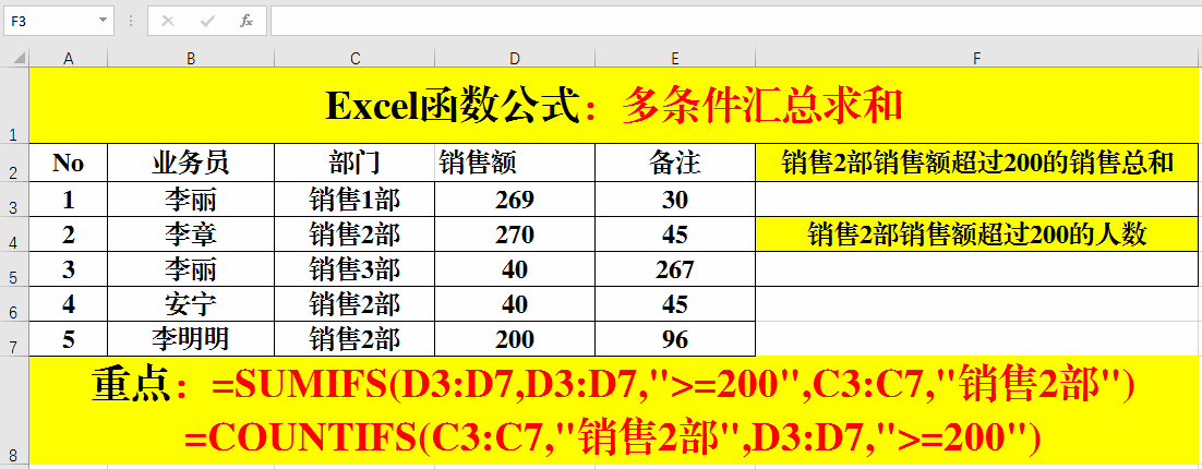 =COUNTIFS(C3:C7,"銷售2部",D3:D7,">=200")。