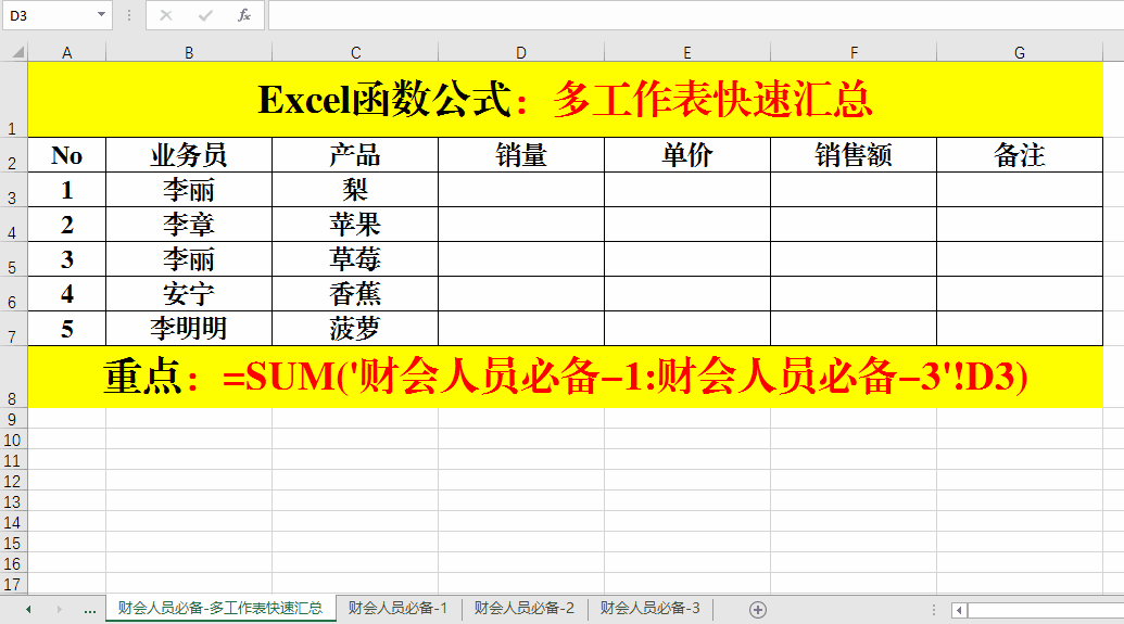 2、輸入公式:=SUM('財(cái)會(huì)人員必備-1:財(cái)會(huì)人員必備-3'!D3)。
