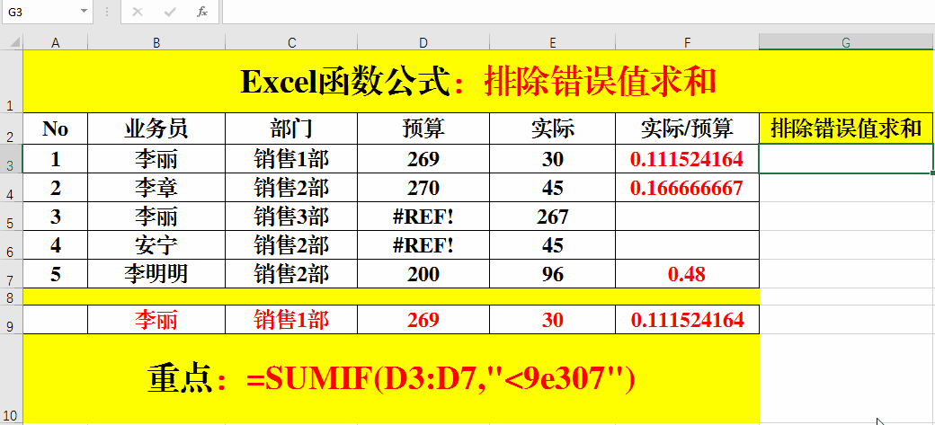 在目標(biāo)單元格中輸入公式:=SUMIF(D3:D7,"<9e307")。