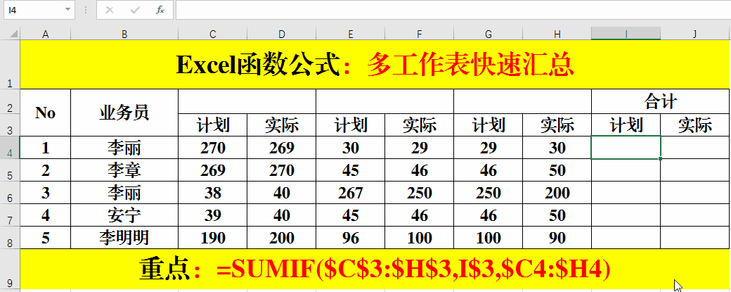 2、輸入公式:=SUMIF($C$3:$H$3,I$3,$C4:$H4)。