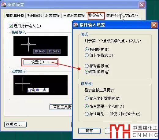 但動態(tài)輸入跟命令行輸入是有區(qū)別的,例如畫直線輸入第一點時是絕對坐標(biāo),但輸入下一點時默認(rèn)是相對坐標(biāo),無需在前面加@。當(dāng)然也可以將動態(tài)輸入設(shè)置成絕對坐標(biāo),如下圖所示。