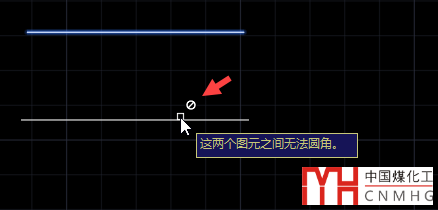 前幾天有位網(wǎng)友知道平行線可以倒圓角,可他操作的時(shí)候怎么都不成功,選擇第二條線的時(shí)候會(huì)出現(xiàn)禁止的圖標(biāo),并提示“這兩個(gè)圖元間無(wú)法圓角”,如下圖所示。