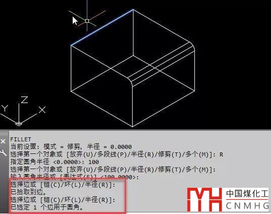 圓角和倒角命令是兩個(gè)比較特殊的編輯命令,不僅可以用于二維圖形的編輯,還可以用來(lái)編輯三維模型,我們可以畫一個(gè)簡(jiǎn)單的方體BOX,然后用圓角命令,三維的操作跟二維有所不同,二維需要選擇兩條線,三維可以可以選擇一條邊,或相互連接的邊界鏈或環(huán),如下圖所示。