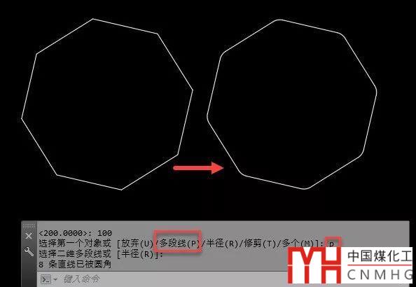 當(dāng)我們對(duì)一個(gè)矩形、多邊形或不規(guī)則形狀的多段線倒圓角的時(shí)候,我們可以采取常規(guī)的操作方式,通過(guò)拾取兩個(gè)邊來(lái)對(duì)其中某個(gè)角倒圓,如果需要對(duì)每個(gè)角做相同半徑的圓角,使用圓角命令的多段線P參數(shù),就可以一次完成所有倒角,如下圖所示。