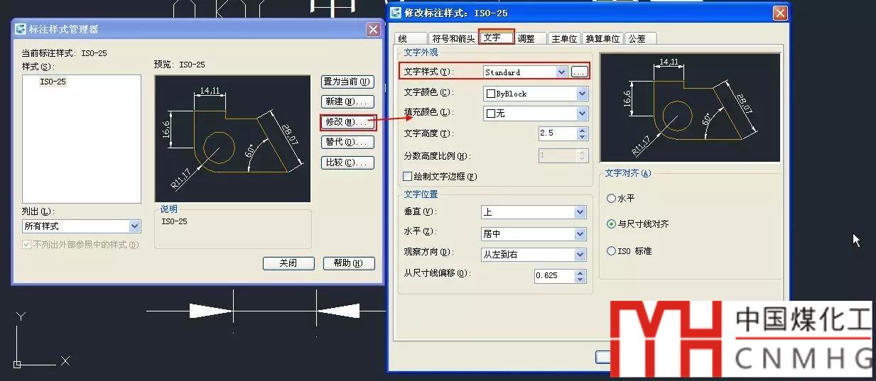 輸入D,打開(kāi)標(biāo)注樣式對(duì)話框,選擇標(biāo)注使用的標(biāo)注演示,單擊修改按鈕,打開(kāi)標(biāo)注樣式修改對(duì)話框,檢查文字樣式設(shè)置,如下圖所示。
