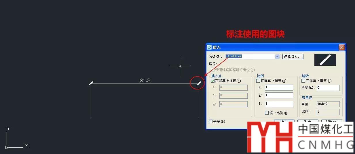 標(biāo)注默認(rèn)的箭頭不是圖塊,但如果用建筑斜線或其他某些形式,箭頭則可能是用圖塊來(lái)表示的。要知道這一點(diǎn)很簡(jiǎn)單,在一張空?qǐng)D中輸入D,回車(chē),將標(biāo)注樣式的箭頭改成建筑標(biāo)記的斜線;創(chuàng)建一個(gè)標(biāo)注;然后輸入I,插入圖塊,就可以看到標(biāo)注箭頭的圖塊,如下圖所示。
