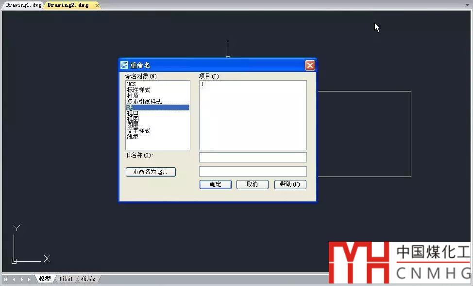 2、在左側(cè)的列表中選擇“塊”,在右側(cè)的列表中選擇“1”,在“重命名”框內(nèi)輸入2,如下圖所示,單擊確定按鈕,將圖塊名從1改成2 。