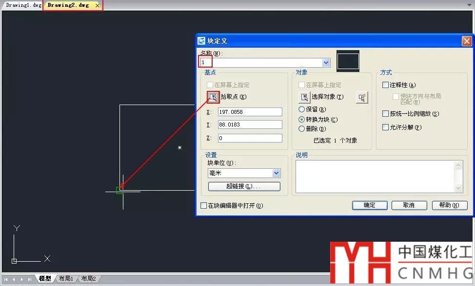 2、單擊新建按鈕,新建一張空?qǐng)D,繪制一個(gè)矩形,輸入B,回車(chē),將矩形定義成圖塊,塊名也設(shè)置為1,插入點(diǎn)設(shè)置在矩形的某個(gè)角點(diǎn),如下圖所示。