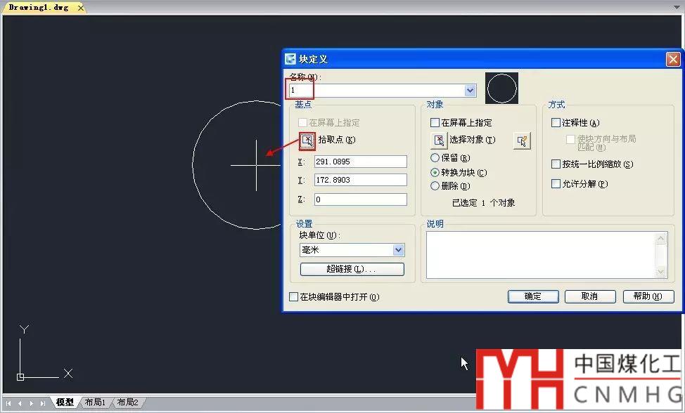 1、新建一張圖紙,畫(huà)一個(gè)圓,輸入B,回車(chē),將圓定義成圖塊,塊名設(shè)置為1,插入點(diǎn)設(shè)置在圓的圓心,如下圖所示。