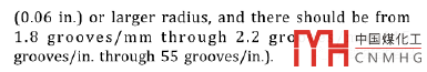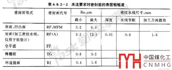 HG管法蘭標(biāo)準(zhǔn)規(guī)定:突面、凹面/凸面及全平面密封面是采用加工刀具加工時自然形成的一種鋸齒形同心圓或螺旋齒槽。加工刀具的圓角半徑應(yīng)不小于1.5mm,形成的鋸齒形同心圓或螺旋齒槽深度約為0.05mm,節(jié)距為0.45~0.55mm。見下面兩個截圖中表格下方的注。