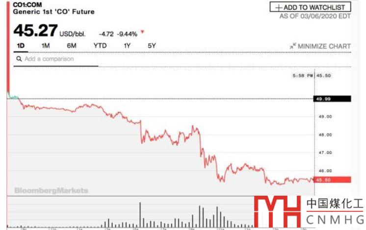 受此消息影響,倫敦商品交易所布倫特5月期貨價格和紐約商品交易所WTI應(yīng)聲下跌10%左右,分別收于每桶45.27美元和41.28美元。