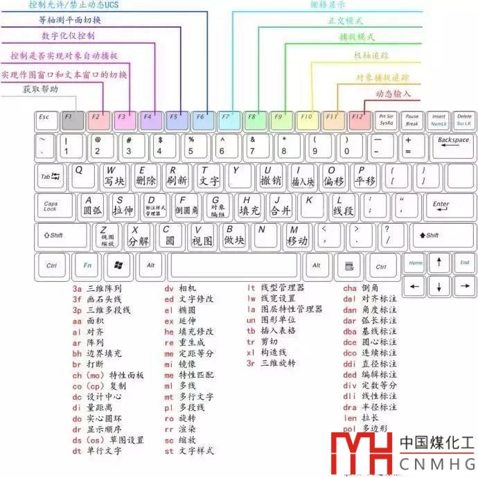 這些鍵盤快捷鍵是在cad的界面文件cui中定義的,執(zhí)行CUI命令,可以在自定義界面對(duì)話框中修改這些快捷鍵。下面是網(wǎng)上流傳的一張快捷鍵鍵盤對(duì)應(yīng)圖。