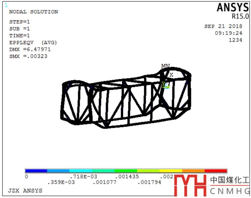 當(dāng)材料進(jìn)入屈服階段后,失效模式與應(yīng)變的相關(guān)性較大,用應(yīng)變作為判據(jù)更合適。因此,可以采用輸入材料的屈服極限,采用小變形理論,線彈性理想塑性材料本構(gòu)關(guān)系,Mises屈服極限及相關(guān)聯(lián)的流動(dòng)準(zhǔn)則,對堆碼試驗(yàn)工況進(jìn)行分析,對分析結(jié)果中的框架查看mises當(dāng)量塑性應(yīng)變,要求當(dāng)量塑性應(yīng)變的最大值<1%,按照1%來評定,結(jié)果偏保守。則可認(rèn)為結(jié)構(gòu)安定到彈性行為。