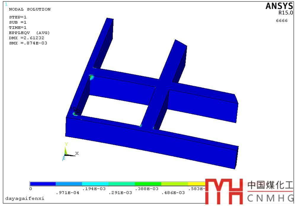 應(yīng)變評定方法還可以包括其他非受壓元件的評定。諸如下面的試壓平蓋,在平蓋上端加固井字形鋼板,其應(yīng)力云圖如圖21和圖22所示。加強(qiáng)結(jié)構(gòu)的等效應(yīng)力為548MPa,超過屈服345MPa。查看塑性應(yīng)變?yōu)?.0087,小于1%,評定合格。如圖23所示。詳見附件4----試壓平蓋命令流。