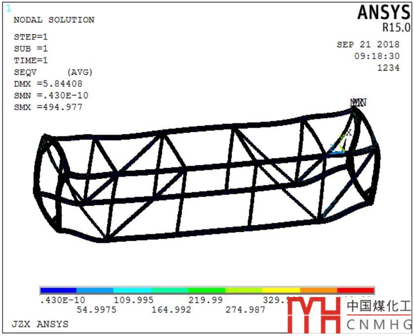 因此,當(dāng)ANSYS 分析移動(dòng)式壓力容器的C3類罐式集裝箱的堆碼試驗(yàn)(頂部四個(gè)角件分別施加848000N)時(shí),一般采取梁殼單元建立模型,分析結(jié)果直接給出了結(jié)構(gòu)的應(yīng)力和應(yīng)變,無需線性化處理??蚣艿淖畲罂倯?yīng)力值可以大于材料的屈服強(qiáng)度,但一般小于兩倍的屈服強(qiáng)度,此時(shí)結(jié)構(gòu)是安定的。