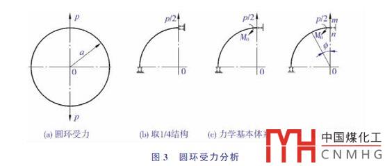 帶有尾部吊耳的裙座底部在起吊時(shí),可視為承受一對(duì)集中力作用的圓環(huán),如下圖所示,受力分析見文獻(xiàn)[1]的1.2。