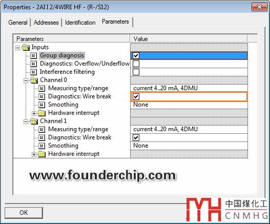 要使用診斷功能,首先模塊本身要支持診斷功能,其次需要在硬件組態(tài)上把診斷功能開啟。比如使用ET200S的2AI 2/4WIRE HF模擬量模塊,該模塊支持?jǐn)嗑€診斷功能。通過勾選“Diagnostics:Wire Break(診斷:斷線)”選項(xiàng),可以開啟通道0和通道1的斷線診斷功能,如下圖: