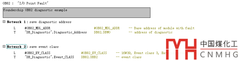 接下來我們在OB82中寫兩段簡單的代碼,將故障發(fā)生時(shí)模塊的地址和事件等級(jí)保存到一個(gè)全局?jǐn)?shù)據(jù)塊中。