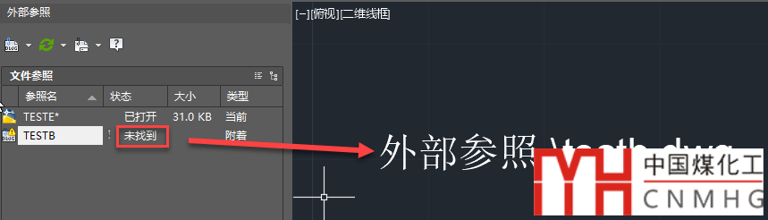 除此以外,還可以嘗試將圖紙A移到其他目錄,然后重新打開B,會發(fā)現(xiàn)插入的外部參照無法顯示,而是顯示了文件路徑和名字。輸入XREF,回車,可以打開外部參照管理器查看外部參照的狀態(tài),如下圖所示。
