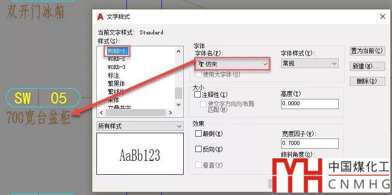 這張圖紙中問號(hào)用的文字樣式是WORD-1。輸入ST回車,打開文字樣式對(duì)話框,查看此文字樣式使用的字體,如下圖所示。