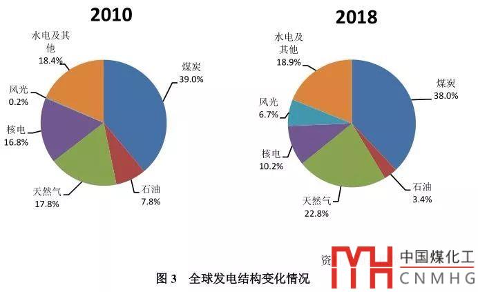 引發(fā)電力行業(yè)碳強度變化的原因之一就是全球發(fā)電結(jié)構(gòu)的變化。2018年,可再生能源和核電滿足了絕大部分的電力需求增長,煤電和天然氣發(fā)電也大幅增加。2010~2018年,化石燃料在發(fā)電結(jié)構(gòu)中的占比有所下降,其中石油占比下降較大,而天然氣占比上升明顯,煤炭占比的變化較為平緩;非化石燃料中,以風光為主的可再生能源占比增長顯著(見圖3)。